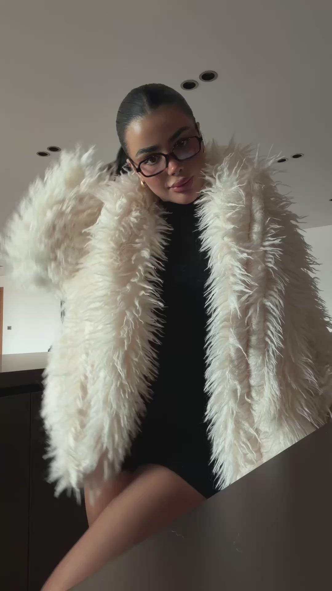 Abrigo de pelo en tono crema, de textura muy esponjosa y con volumen que aporta un efecto lujoso y llamativo. Presenta un corte amplio con hombros relajados y mangas largas, creando una silueta envolvente y muy abrigada. Su acabado suave y de pelo largo le da un aire sofisticado y glamuroso, ideal para elevar cualquier look de invierno con un toque chic y moderno.
